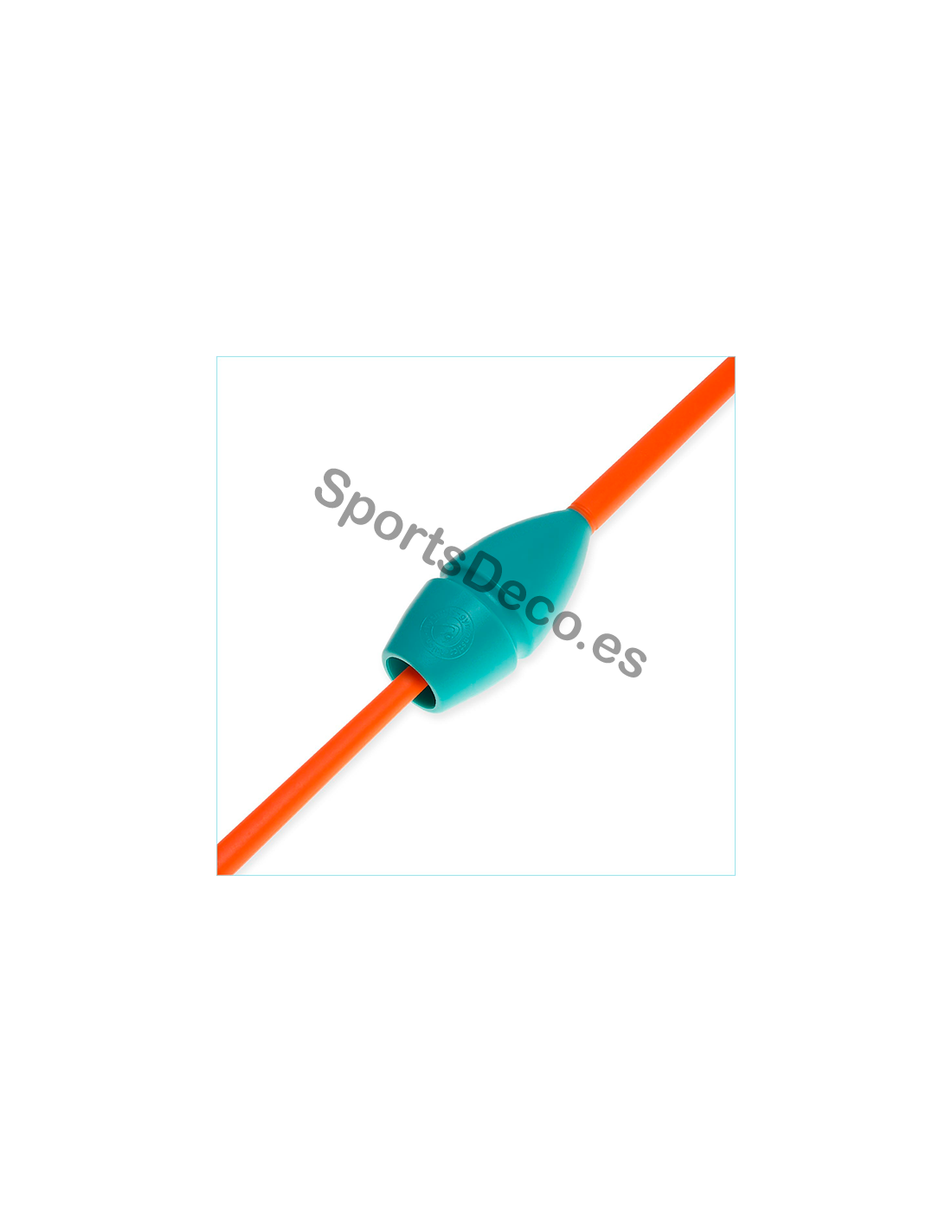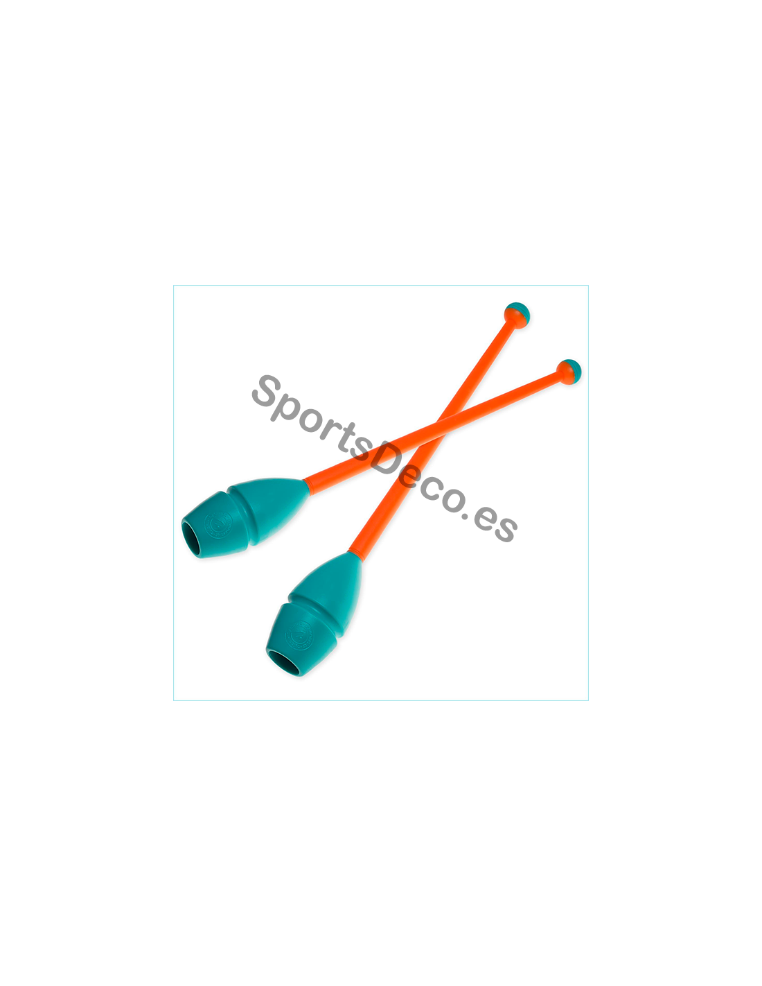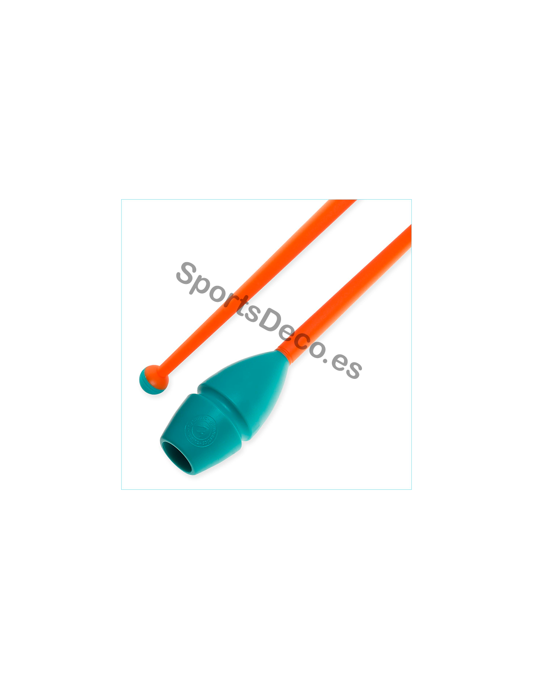 Mazas de goma bicolor engarzable para gimnasia rítmica. Cabeza de caucho (Aguamarina) y palo de plástico (Naranja).
