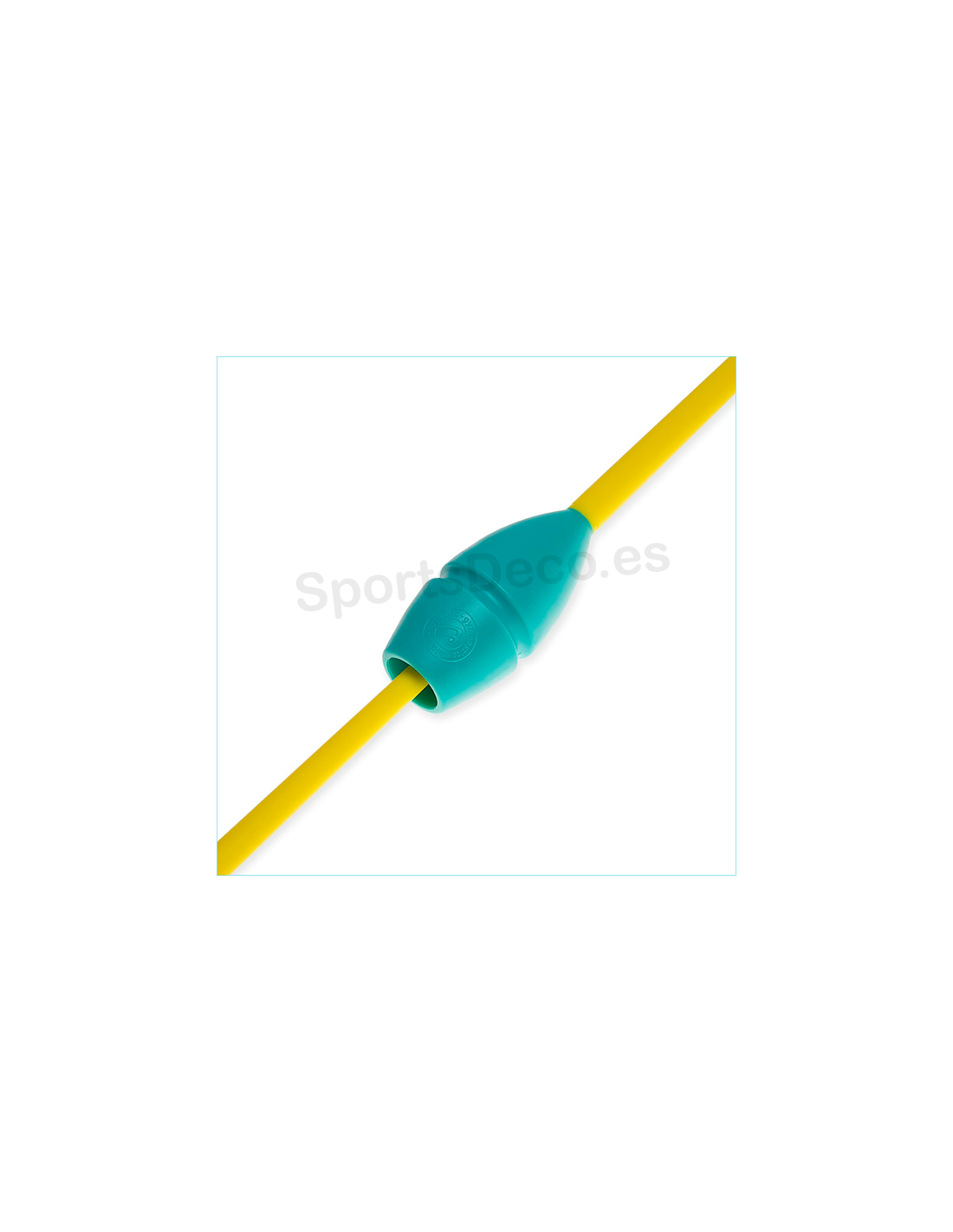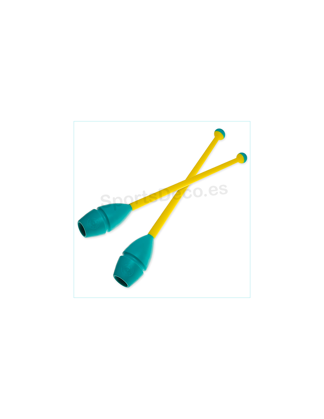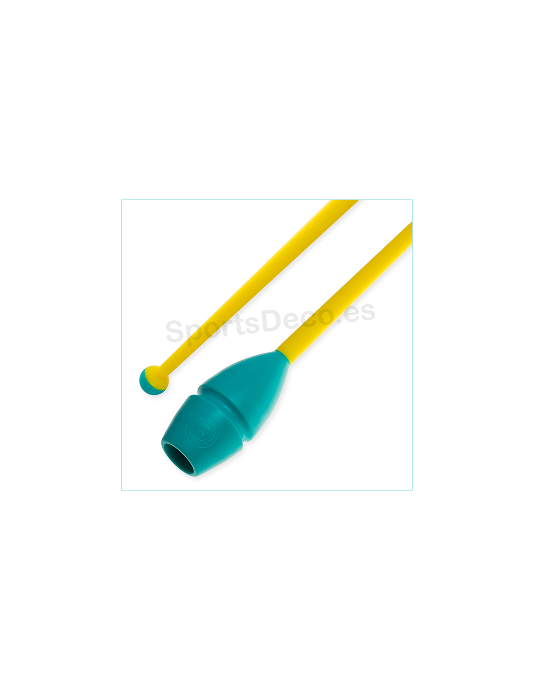 Mazas de goma bicolor engarzable para gimnasia rítmica. Cabeza de caucho (Turquesa) y palo de plástico (Amarillo).