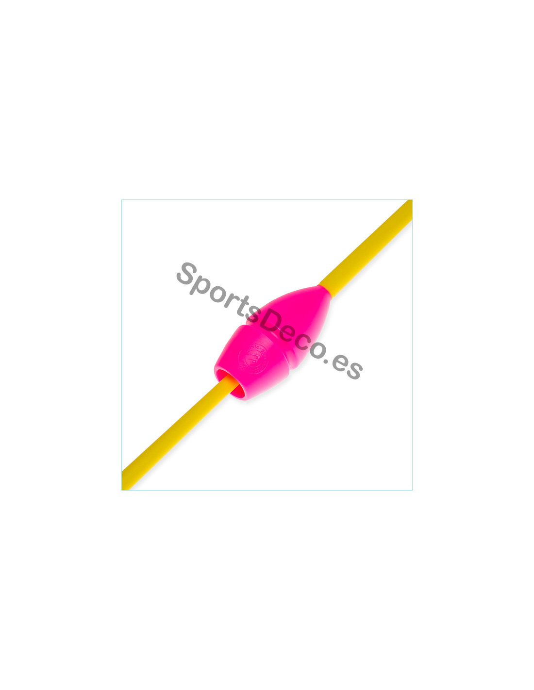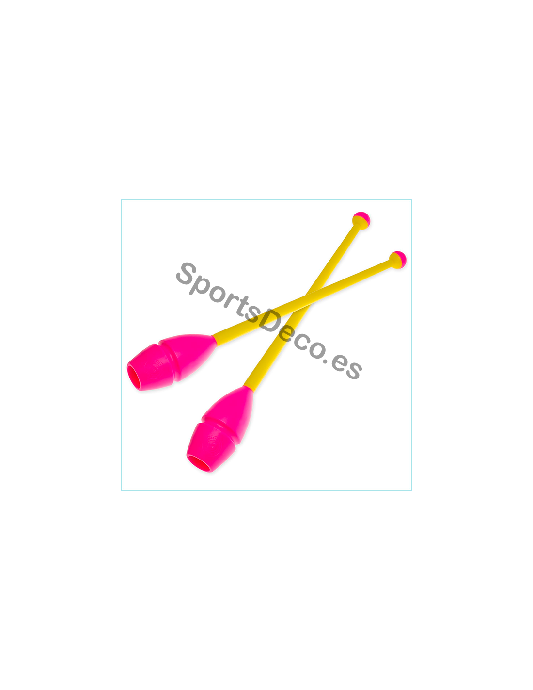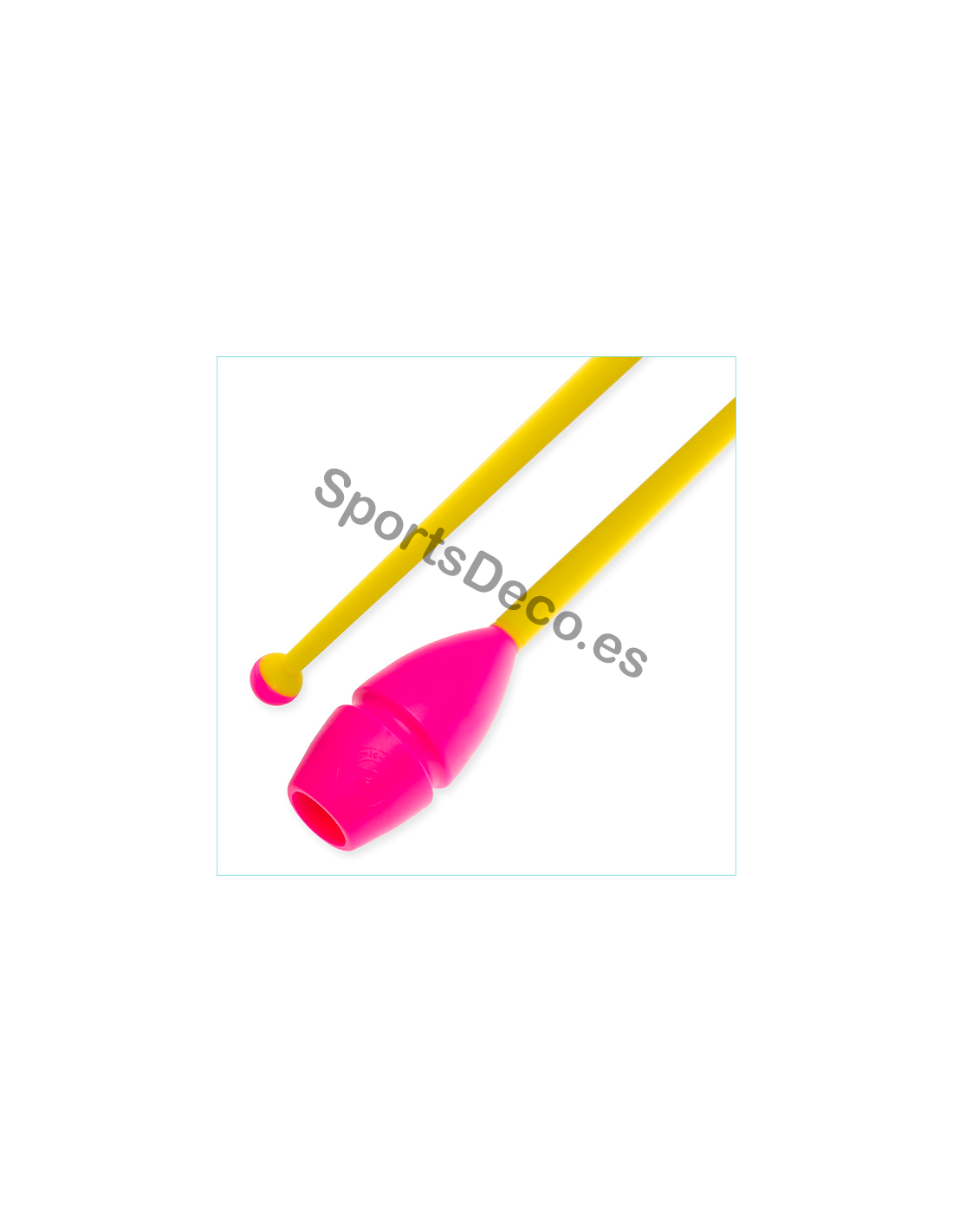 Mazas de goma bicolor engarzable para gimnasia rítmica. Cabeza de caucho (Rosa) y palo de plástico (Amarillo).