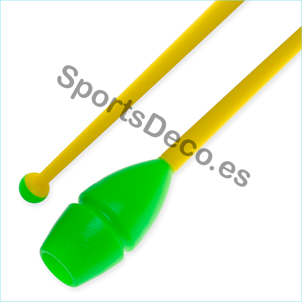 Mazas de goma bicolor engarzable para gimnasia rítmica. Cabeza de caucho (Verde) y palo de plástico (Amarillo).