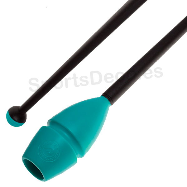 Mazas de goma bicolor engarzable para gimnasia rítmica. Cabeza de caucho (Aguamarina) y palo de plástico (Negro).